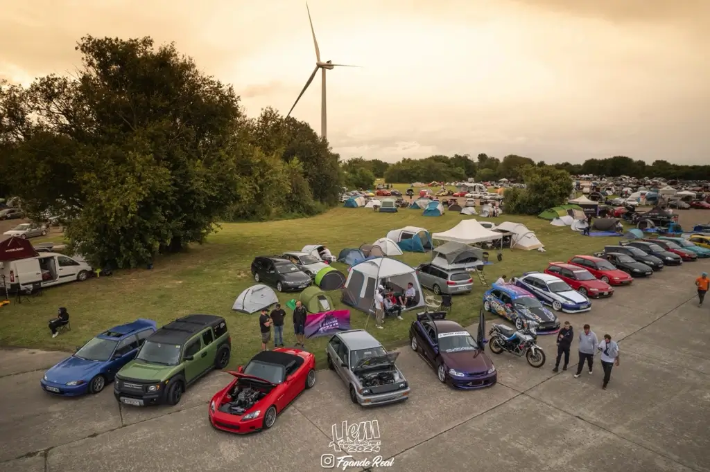 The setting is an old military airfield near Saint-Quentin in the Aisne region of northern France – flat, functional, and perfectly suited to the grassroots atmosphere. The layout splits between track and static areas: on one side, competitive sessions see everything from stock EK Civics to 800-horsepower turbocharged drag builds attacking the circuit; on the other, row after row of carefully presented machinery ranges from immaculate DC2 Integra Type Rs to wire-tucked show cars to imported JDM legends rarely seen on European roads.